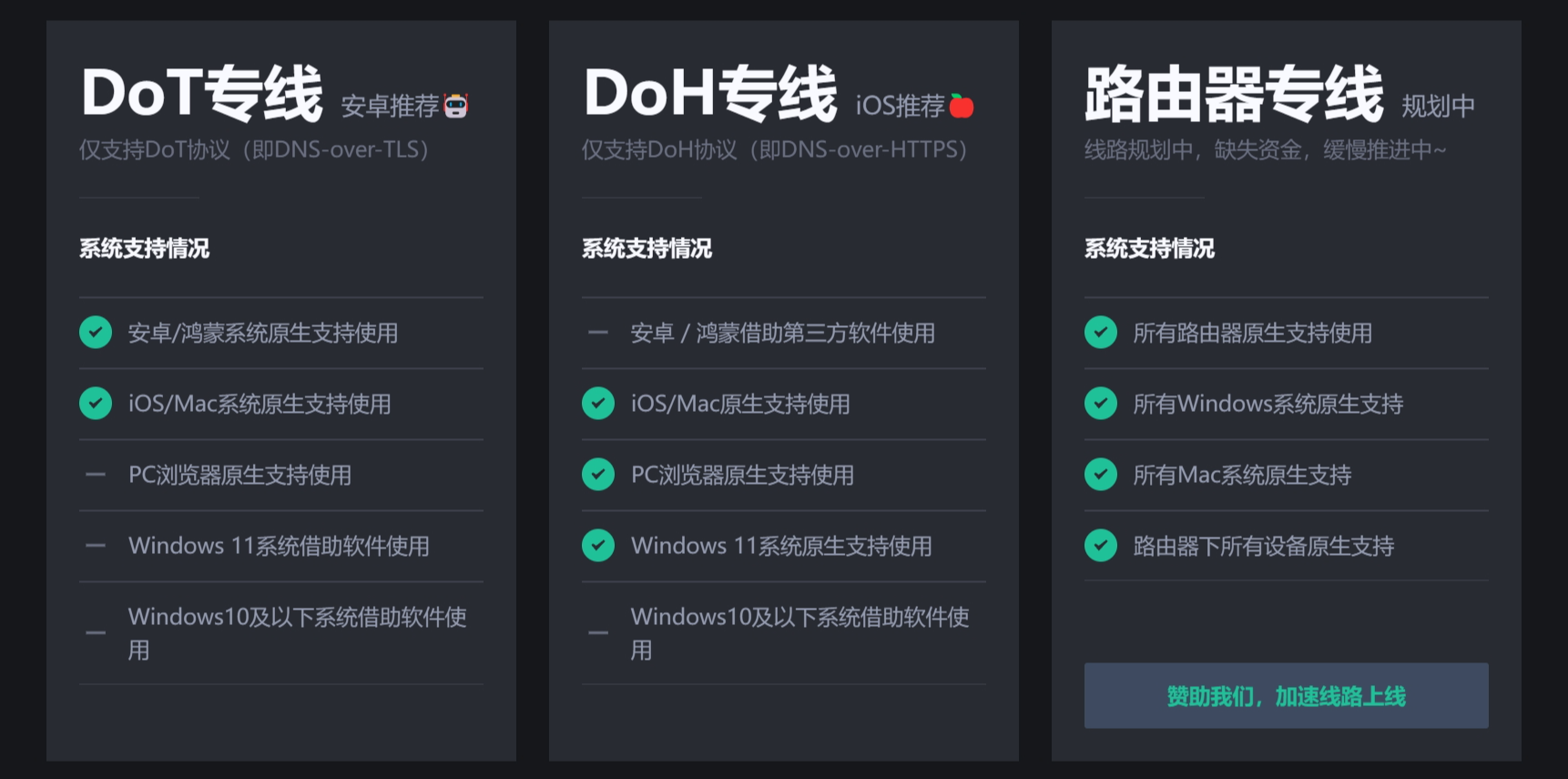 这是一个很小众的具备广告拦截的境内公共DNS服务,从介绍来看,确实也还不错,提供了DoT和DoH服务,有相对完整的配置介绍。