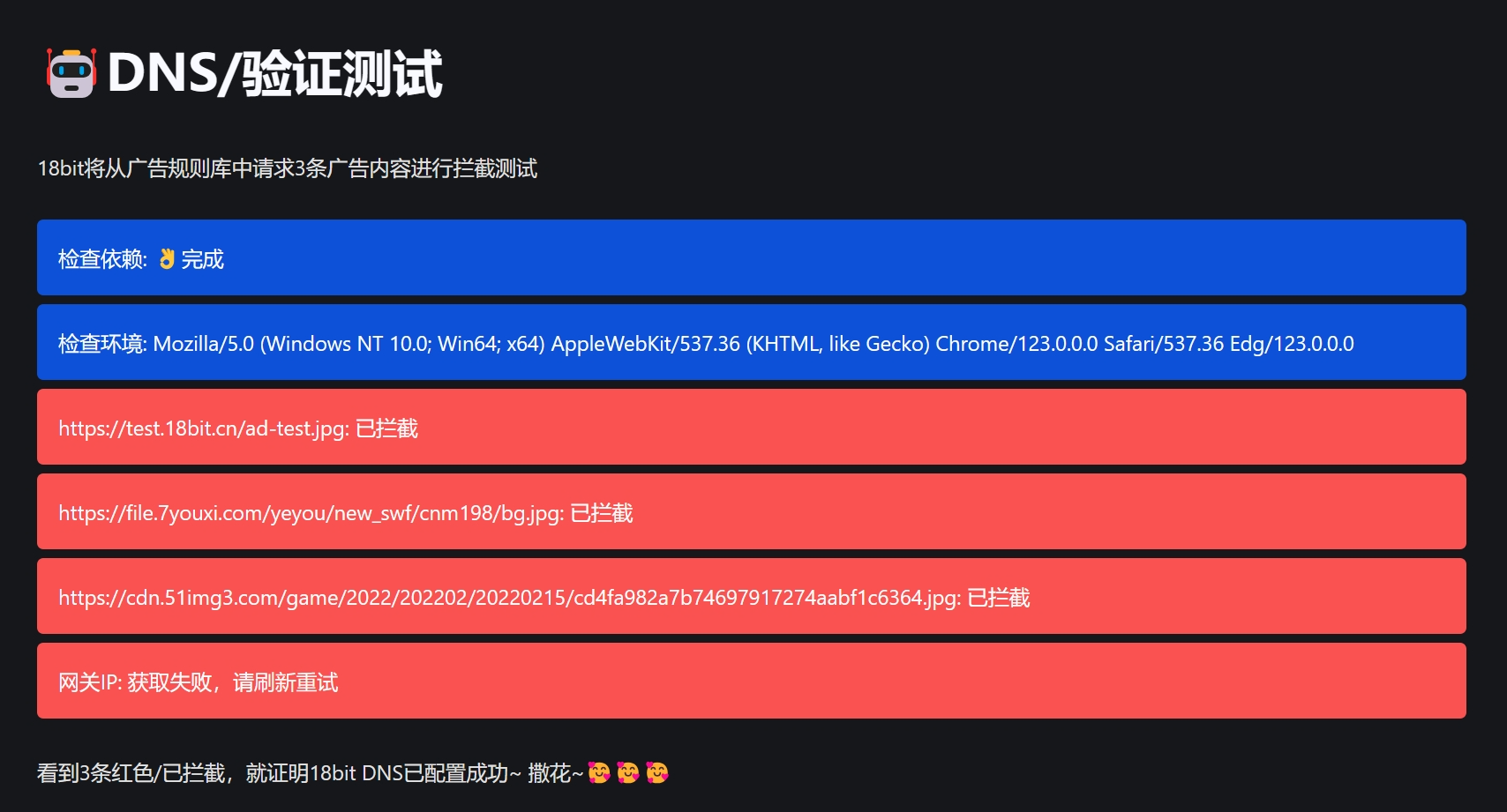 有服务上线的心路历程,配置成功后也可以通过官方的页面进行拦截测试,我还是使用Adguard这个工具来修改DNS,测试结果如下。