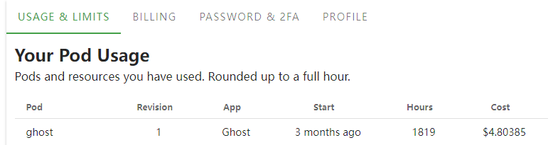 可以查看你的应用程序的使用情况,例如我的Ghost博客已经上线几个月了,可以简单查看运行了多少个小时,以及花费情况。