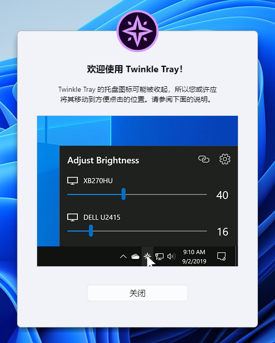 启动后会有一个小窗欢迎界面,会提示如何操作。可以调整屏幕亮度,也可以关闭显示器。